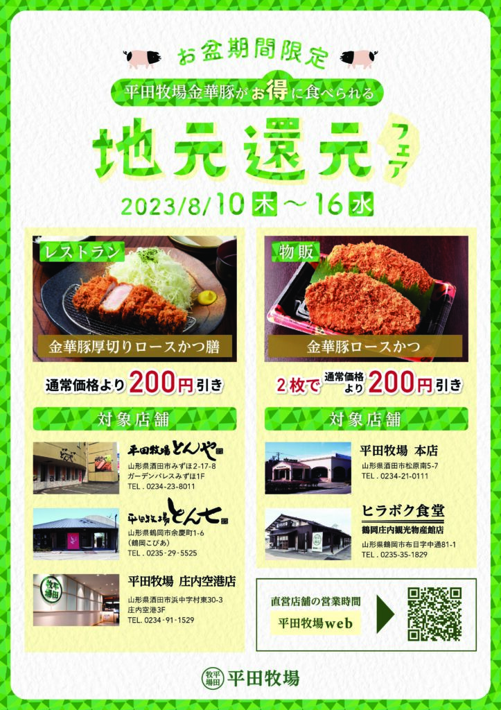 庄内地域の平田牧場の直営店舗にて、お盆期間限定「地域還元フェア」を開催いたします!