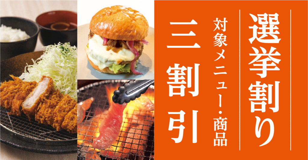内容:投票済証のご提示で、対象商品を1会計分、三割引でご提供します