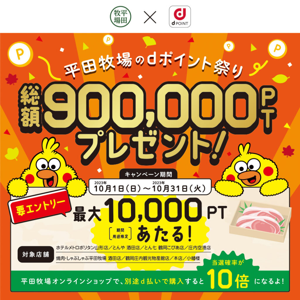 さらに、期間中平田牧場オンラインショップで別途d払い決済でご注文をされた場合は、当選確率が10倍になります。