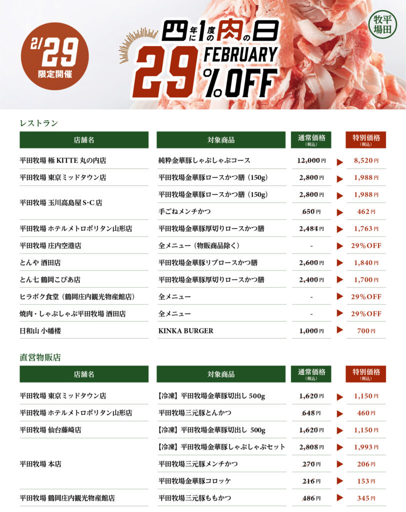 カラダが自然に喜ぶ本当に美味しい豚肉とは、「健康に育った豚」に他なりません。生産効率を最優先するのではなく、手間と時間をかけ育てた、平田牧場金華豚、 平田牧場三元豚などの平田牧場独自のブランド豚を、“4年に一度の肉の日”を記念して、レストランでのお食事や、直営物販店や公式オンラインショップでのお買い物がお得になるこの機会をぜひご利用ください。今回は、一部店舗にて全メニュー29%OFFなど、目玉企画もご用意しております。