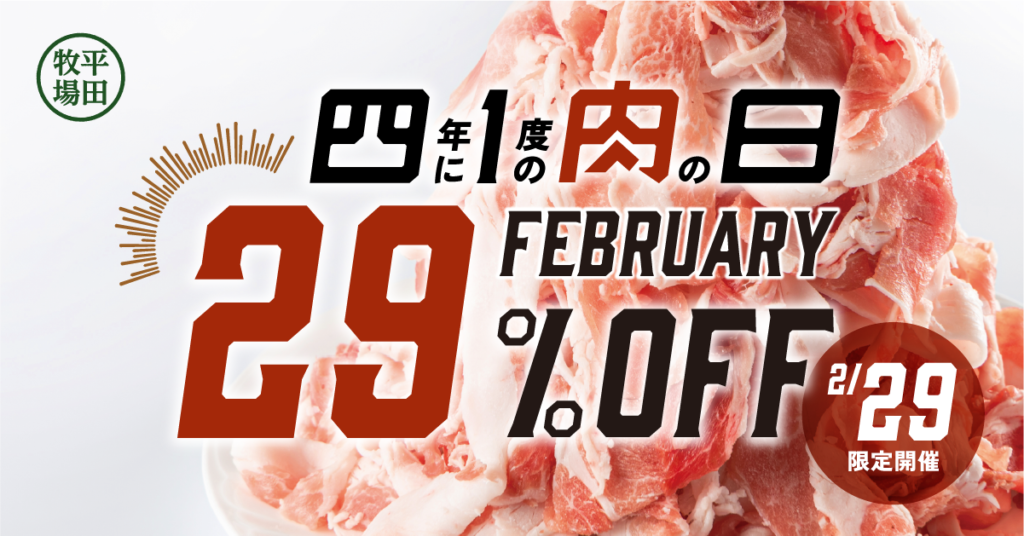 株式会社平田牧場(山形県酒田市/代表取締役 新田嘉七)は、2024年2月29日の“4年に一度の肉の日”を記念して、期間限定で対象店舗にて、「4年に一度の肉の日!29%OFFキャンペーン」を実施いたします。