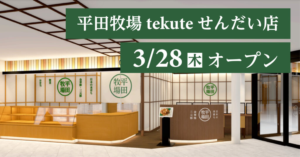 株式会社平田牧場(山形県酒田市/代表取締役 新田嘉七)は、2024年3月28日(木)にJR東日本東北総合サービス株式会社(宮城県仙台市/代表取締役 松木茂)が管理・運営する商業施設「tekute せんだい(てくてせんだい)」に「平田牧場 tekuteせんだい店」をオープンします。