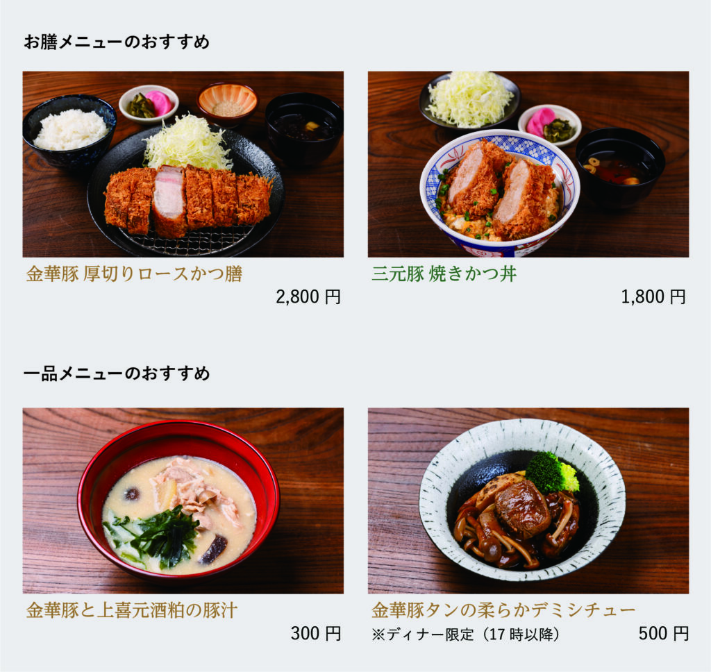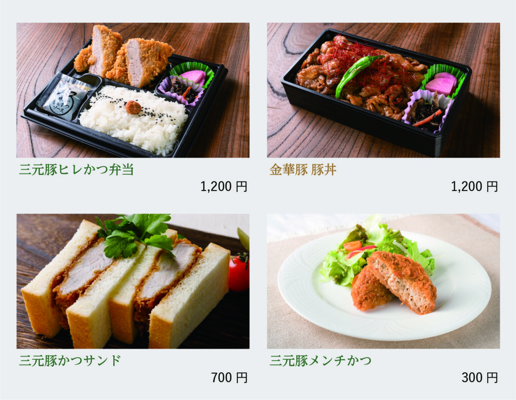 自家用からお土産、贈答用、お弁当まで、幅広いニーズにお応えできるよう展開します。「三元豚ヒレかつ弁当」(1,200円)、 「金華豚豚丼」(1,200円)、 「三元豚かつサンド」(700円)、 「三元豚メンチかつ」など、新幹線でも食べやすいお弁当や食卓の一品に嬉しい惣菜メニューもご用意。いずれも無添加にこだわり、素材のおいしさを最大限引き出したおすすめの逸品です。
