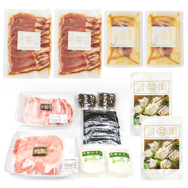 日本の米育ち金華豚ロースしゃぶしゃぶ用 (300g)×1/日本の米育ち金華豚バラしゃぶしゃぶ用 (200g)×1/とび魚ぽん酢 (50ml)×4/きざみ昆布 (10g)×2/大根おろし (100g)×2/日本の米育ち金華豚 カルビたれ漬け (180g)×2/日本の米育ち金華豚 特製味噌漬け (112g)×2/日本の米育ち 金華豚しゅうまい (256g/8個入)×2