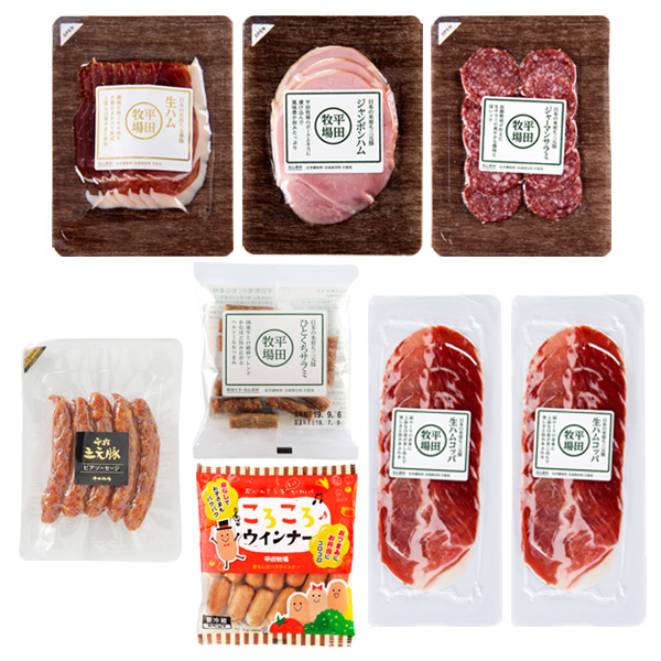 日本の米育ち金華豚 生ハム (50g)×1/日本の米育ち三元豚 生ハムコッパ (50g)×2/平田牧場三元豚ジャンボンハム (60g)×1/日本の米育ち三元豚 ひとくちサラミ (50g)×1/日本の米育ち三元豚 ジャーマンサラミ (30g)×1/平田牧場三元豚ビアソーセージ (70g)×1/平田牧場ころころウインナー (90g)×1