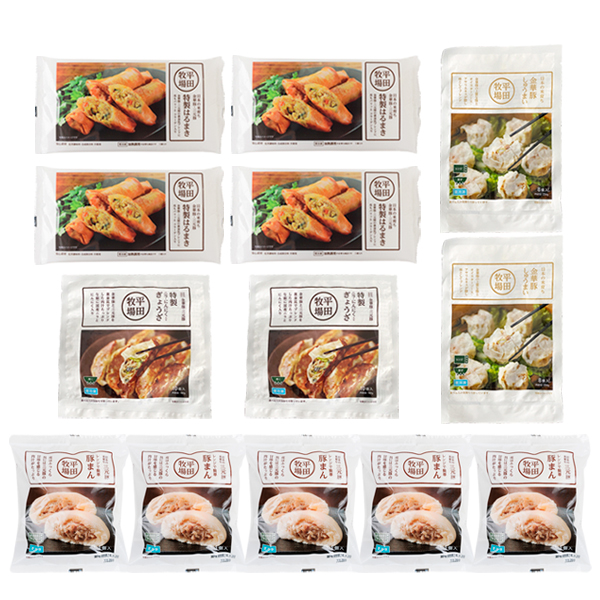 平田牧場 特製はるまき (225g/5個入)×4/日本の米育ち金華豚・三元豚 ニラ・にんにく入り 特製ぎょうざ (180g/10個入)×2/日本の米育ち 金華豚しゅうまい (256g/8個入)×2/日本の米育ち三元豚 豚まん(100g/1個入)×5