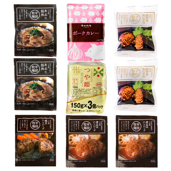 日本の米育ち金華豚 肉巻きおにぎり (120g)×2/日本の米育ち三元豚 あぶり豚丼 (130g)×2/平田牧場三元豚ポークカレー (180g)×1/特別栽培米 つや姫 (150g×3P)×1/日本の米育ち三元豚 焼きハンバーグ (105g)×1/日本の米育ち三元豚 煮込みハンバーグ (135g)×2
