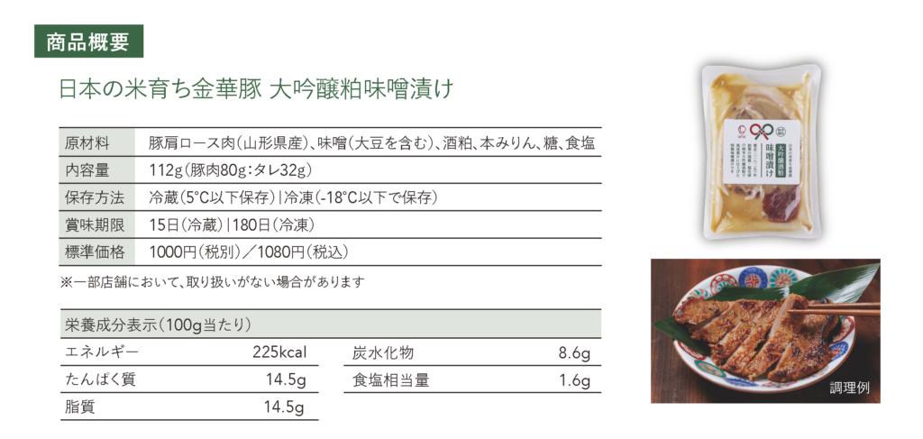 東京ミッドタウン(東京都港区)ガレリア B1に同居する二社による初コラボレーション企画です。日本の米を食べて育ったブランド豚「平田牧場金華豚」の肩ロース肉を、1625年(寛永二年)創業、金沢の老舗酒蔵 福光屋の「加賀鳶 純米大吟醸酒粕」と「純米本味醂 福みりん」を加えた特別仕様の味噌で漬け