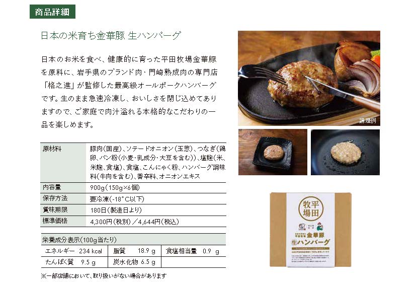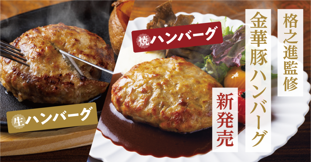 平田牧場のブランド豚「金華豚」を原料に、「生ハンバーグ」と「焼ハンバーグ」の2種類を開発しました。