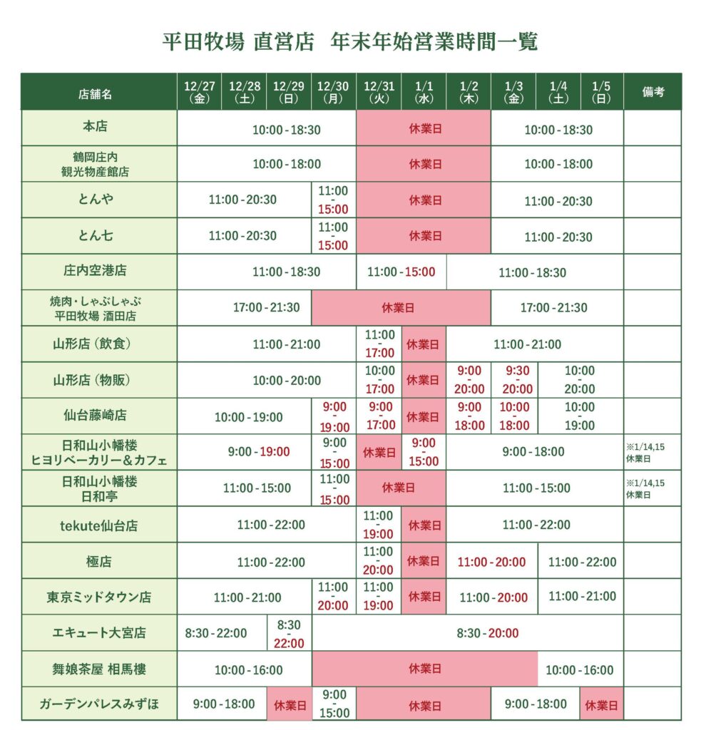 平田牧場直営店では、年末年始の営業日につきまして、下記のとおり休業させていただきます。