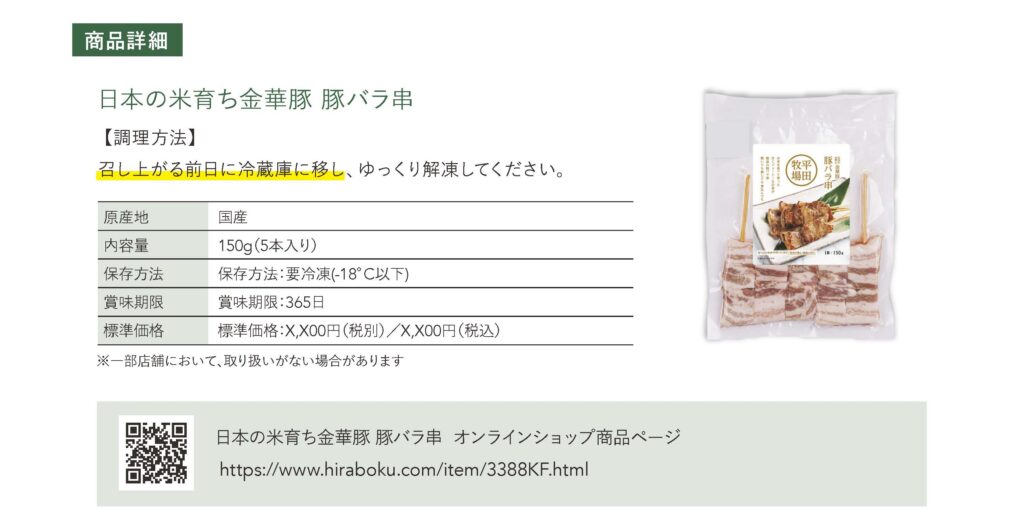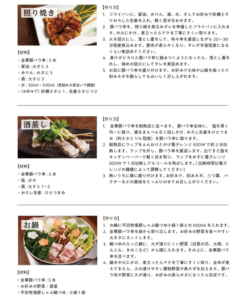 平田牧場が誇る高級ブランド豚「日本の米育ち金華豚」のバラ肉を手軽にお楽しみいただけるよう、丁寧に串打ちしたものです。ご家庭のグリルやフライパンで調理するだけで、とろけるような白身の甘みと、絹のようにきめ細かな肉質を存分にご堪能いただけます。焼き物以外にも蒸したり、煮込んだり、様々な料理にご活用いただけます。
