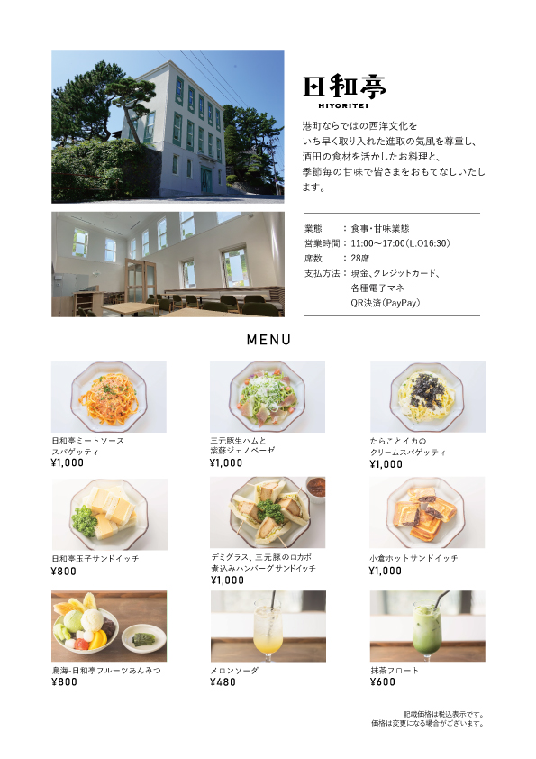 「日和亭」は、大正時代に西洋文化をいち早く取り入れた小幡洋食部の進取の気風を受け継ぎ、伝統的なレシピの中に新たなエスプリを込めて温故知新の一皿にしてご提供いたします。高品質なプレミアムクラスのデュラム小麦のセモリナ、食塩だけを原料に、イタリア伝統のパスタ作りで小麦の風味と味を最大限に引き出した無添加の生パスタを、平田牧場金華豚・三元豚や海の幸を活かしたオリジナルソースのスパゲッティや、話題の玉子サンドイッチ、和を基調とした季節毎の甘味をお楽しみいただけます。