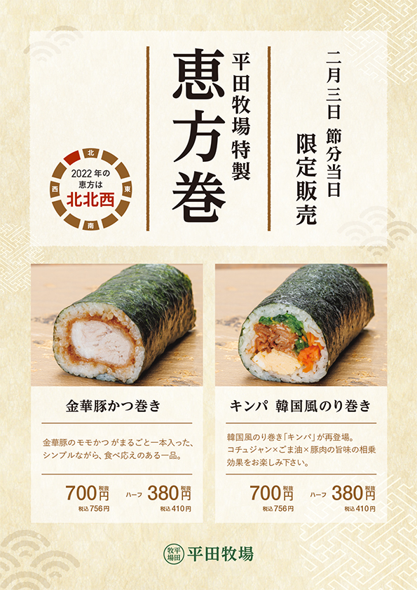 平田牧場金華豚を使用した特製恵方巻を平田牧場直営店にて販売いたします。