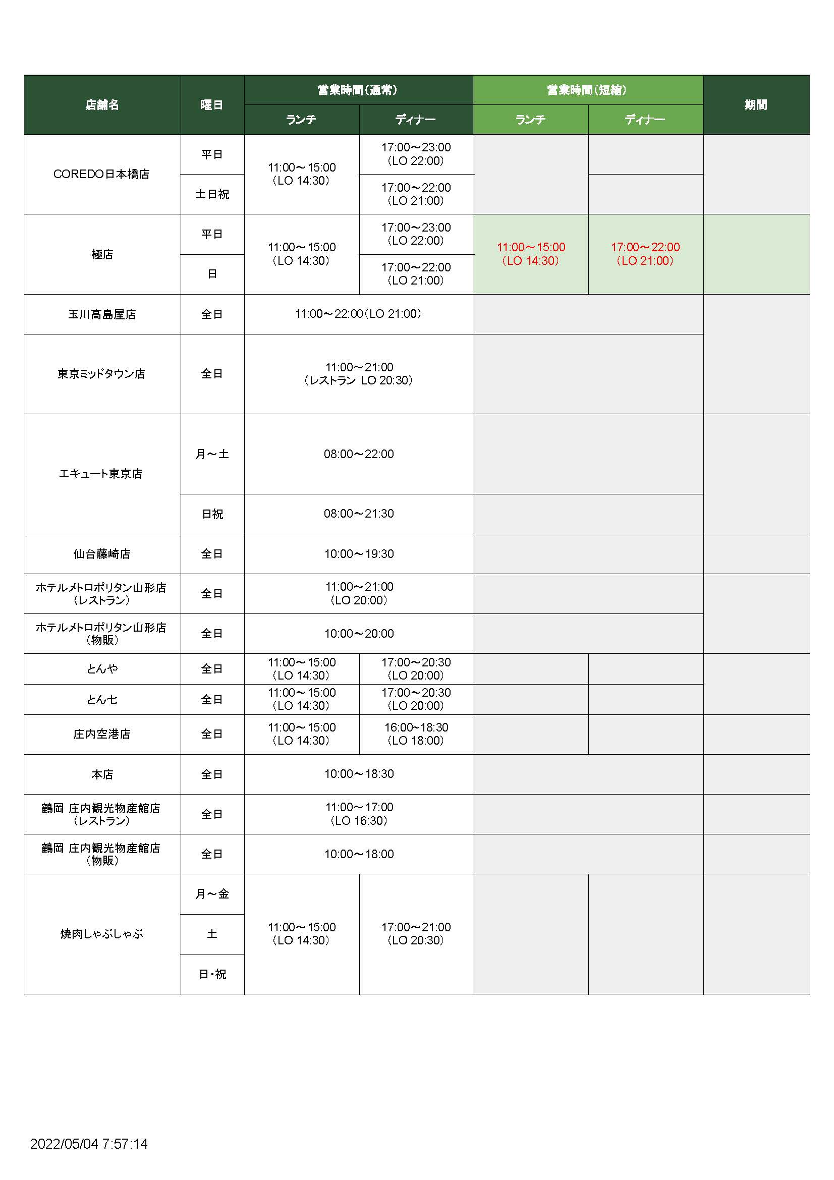 新型コロナウイルスの感染拡大状況を鑑み、お客様と従業員の安全を第一に考え、一部店舗の時短営業の延長及び変更させていただきます。