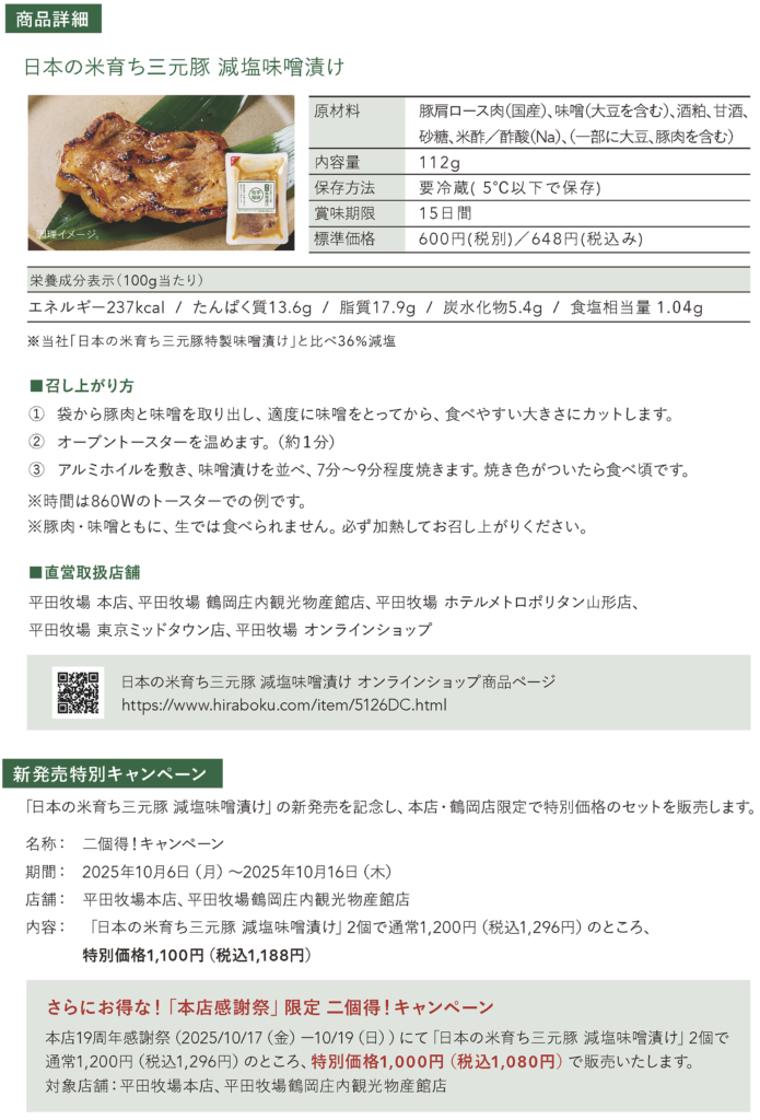 高まりに応え、おいしさはそのままに塩分を36%カット※ した「日本の米育ち三元豚 減塩味噌漬け」を直営オンラインショップで先行発売致します。(一部直営店は2025年10月6日(月)より発売開始。)